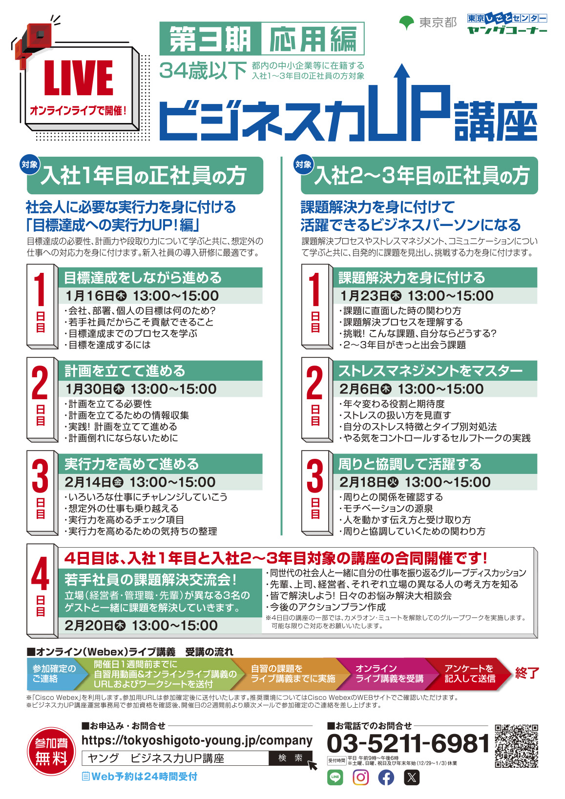 | タイトル | 【入社1年目対象】オンライン_ビジネス力UP講座 第3期 応用編【34歳以下】 |