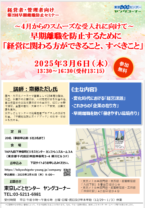 | タイトル | 第2回早期離職防止セミナー〔経営者・管理者向け〕 |