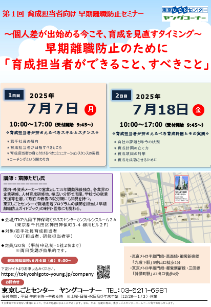 | タイトル | 第1回早期離職防止セミナー〔育成担当者向け〕※1日のみの参加も可能です※ |