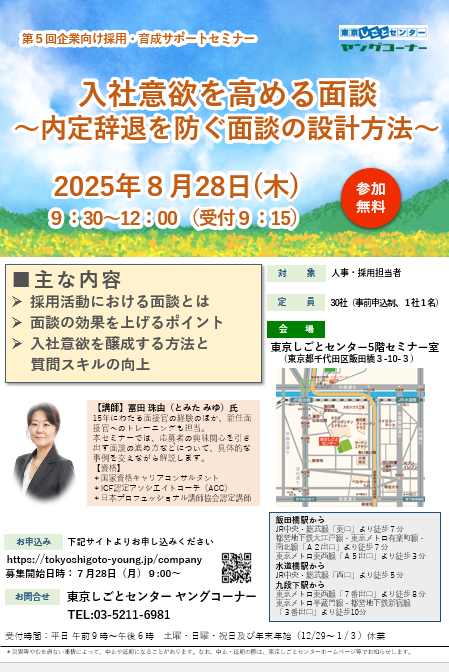 タイトル 第5回企業向け《採用・育成サポート》セミナー 「入社意欲を高める面談」