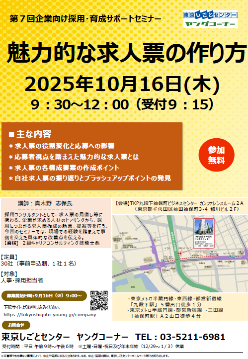 | タイトル | 第7回企業向け《採用・育成サポート》セミナー「魅力的な求人票の作り方」 |