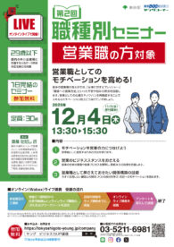 | タイトル | 【ビジネス力UP講座】第2回職種別セミナー<営業職編>(入社2~3年目対象/29歳以下)参加無料・オンライン開催 |