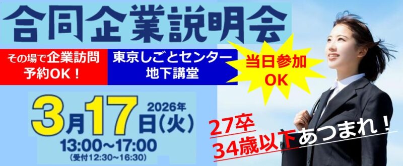 | 参加費 | 無料 ※初めてご利用の方(しごとセンター多摩登録者で、飯田橋のしごとセンターを初めて利用される方を含む)は、前日までに利用手続きをお願いしております。東京しごとセンター1階総合相談へお越しください。 |