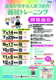 ◆持ち物:しごとセンターカード、筆記用具 ※面接カード、履歴書・職務経歴書は、持参不要です。面接カードや応募書類に沿って個別面接練習をご希望の方は、ヤングコーナーアドバイザーへご相談ください。➡ ℡ 03-5211-6351 または、9/17(水)、11/6(木)超リアル模擬面接にお申込みください。(受付開始日をご確認ください)