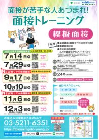 ◆持ち物:しごとセンターカード、筆記用具 ※面接カード、履歴書・職務経歴書は、持参不要です。面接カードや応募書類に沿っての面接練習をご希望の方は、ヤングコーナーアドバイザーへご相談ください。➡ ℡ 03-5211-6351 または、9/17(水)、11/6(木)超リアル模擬面接にお申込みください。(受付開始日をご確認ください)