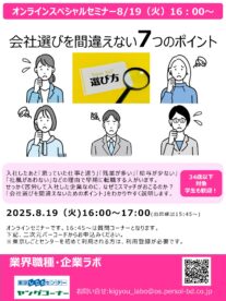 | タイトル | 【オンライン】スペシャルセミナー 会社選びを間違えない7つのポイント |