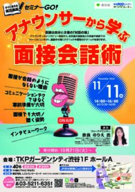 | タイトル | 【満席】NEW!アナウンサーから学ぶ面接会話術<11/11>TKPガーデンシティ渋谷 |