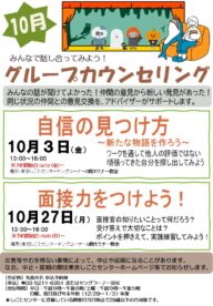 | グループカウンセリング「面接力をつけよう!」 | 面接官の知りたいことって何だろう?面接のポイントを押さえてから模擬面接にチャレンジ!面接を客観視しながら、自分自身の良い点や改善点を見つけ、面接に慣れていきましょう。