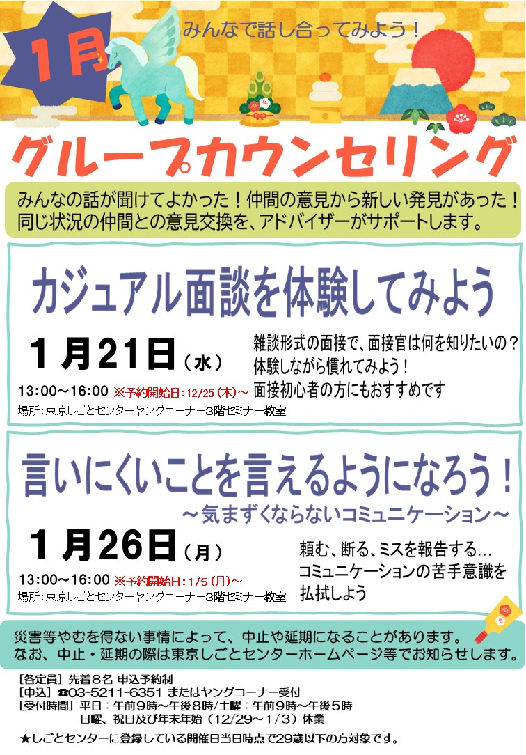 | 参加対象 | 東京しごとセンターに登録済で、ヤングコーナーで初回カウンセリングを受けている方。かつ、開催日当日時点で29歳以下の方。 |