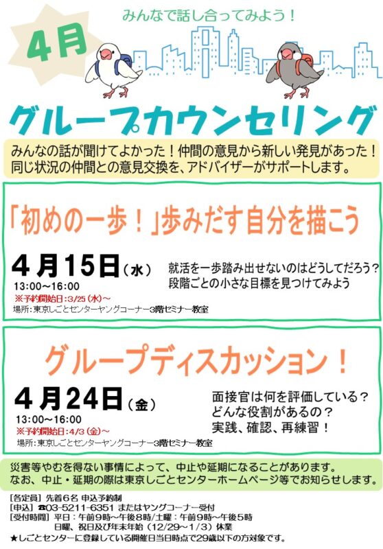 ※グループカウンセリングのご予約は、事前にしごとセンターへの登録が必要です。