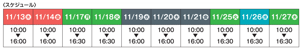 10:00~16:00 または 10:00~16:30★土・日・祝日を除く10日間のプログラムです。