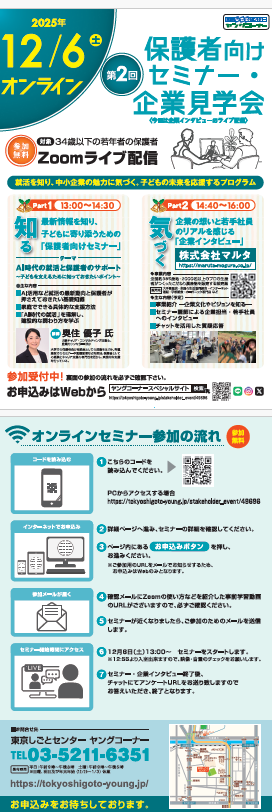 | タイトル | 【オンライン開催※参加無料※】第2回保護者向けセミナー・企業見学会(今回は企業インタビューのライブ配信) |